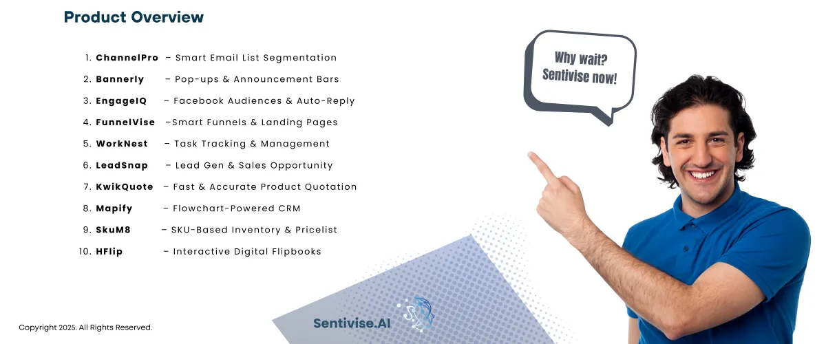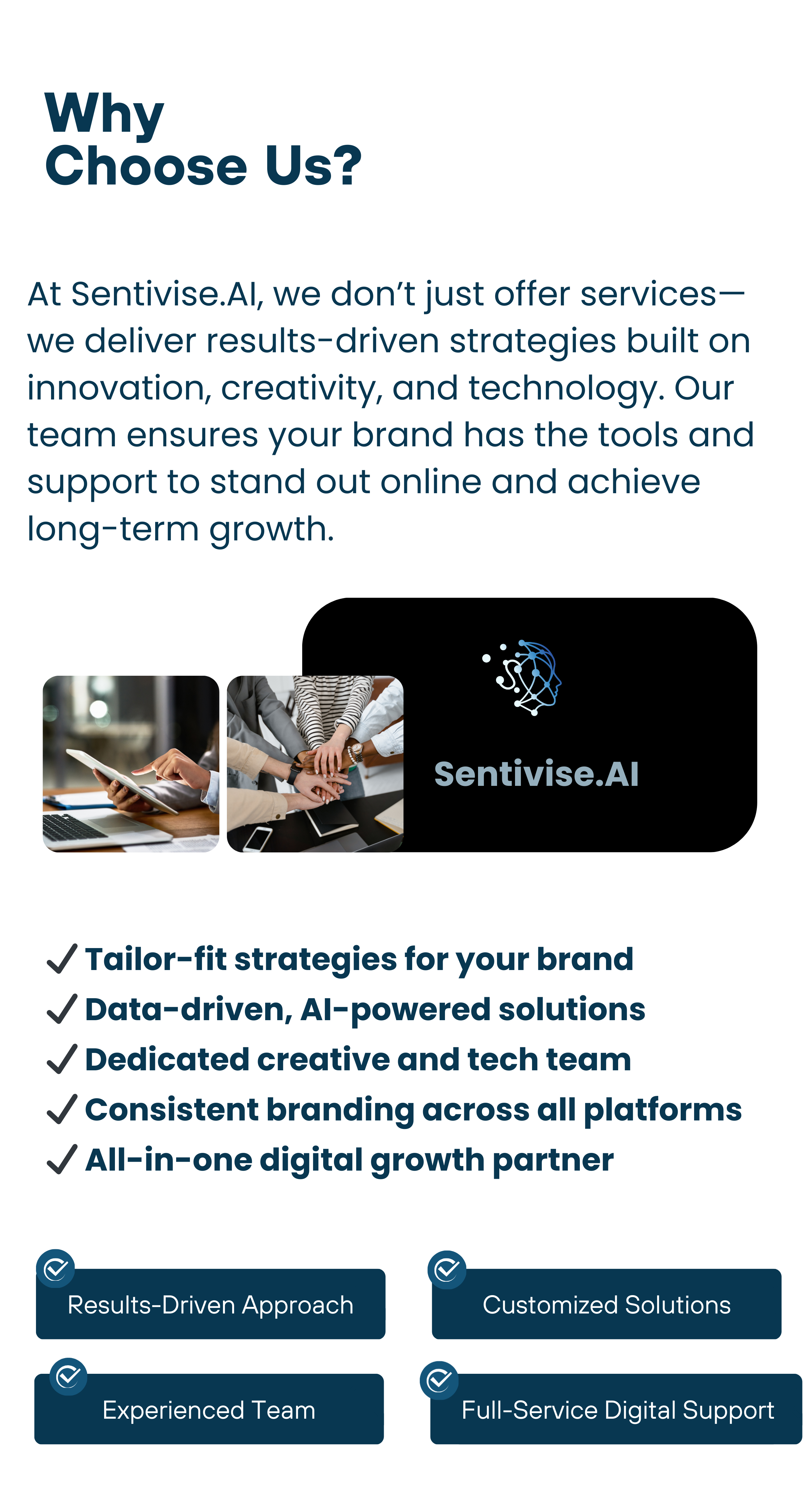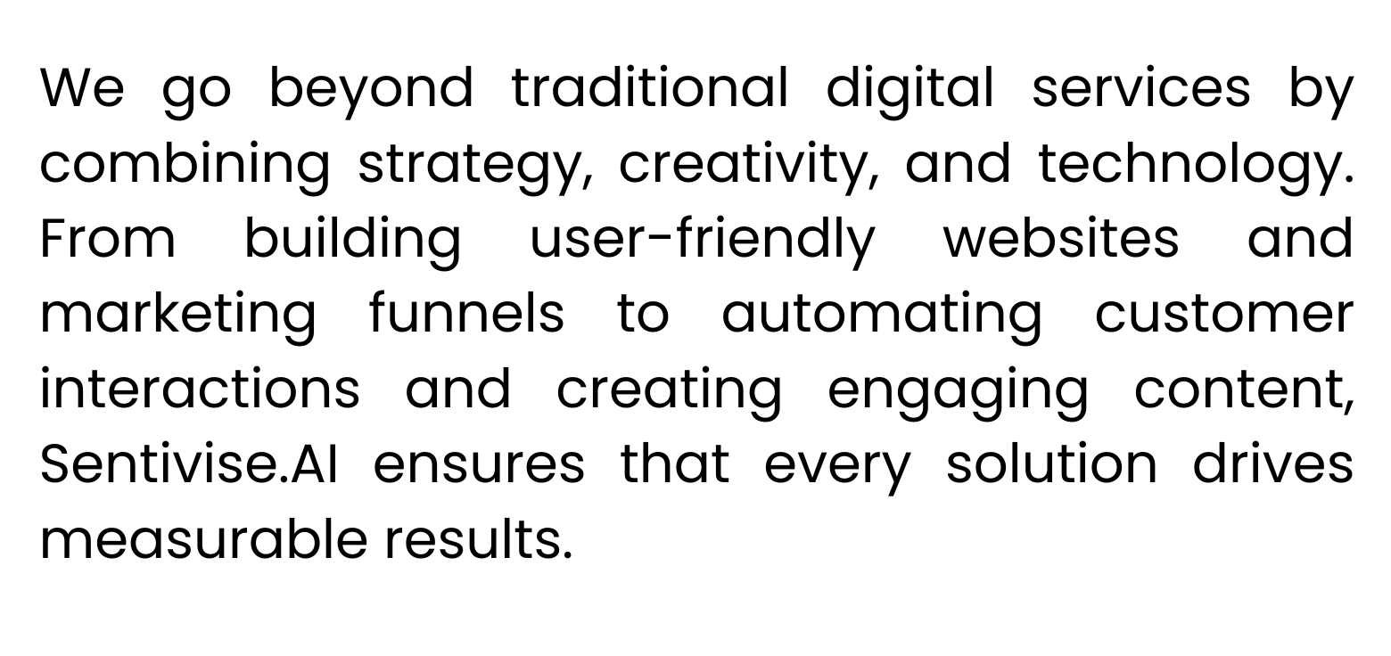 "We go beyond traditional digital services by combining strategy, creativity, and technology. From building user-friendly websites and marketing funnels to automating customer interactions and creating engaging content, Sentivise.AI ensures that every solution drives measurable results. "